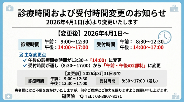 2026年4月1日より、診療時間および受付時間を下記の通り変更させていただきます。